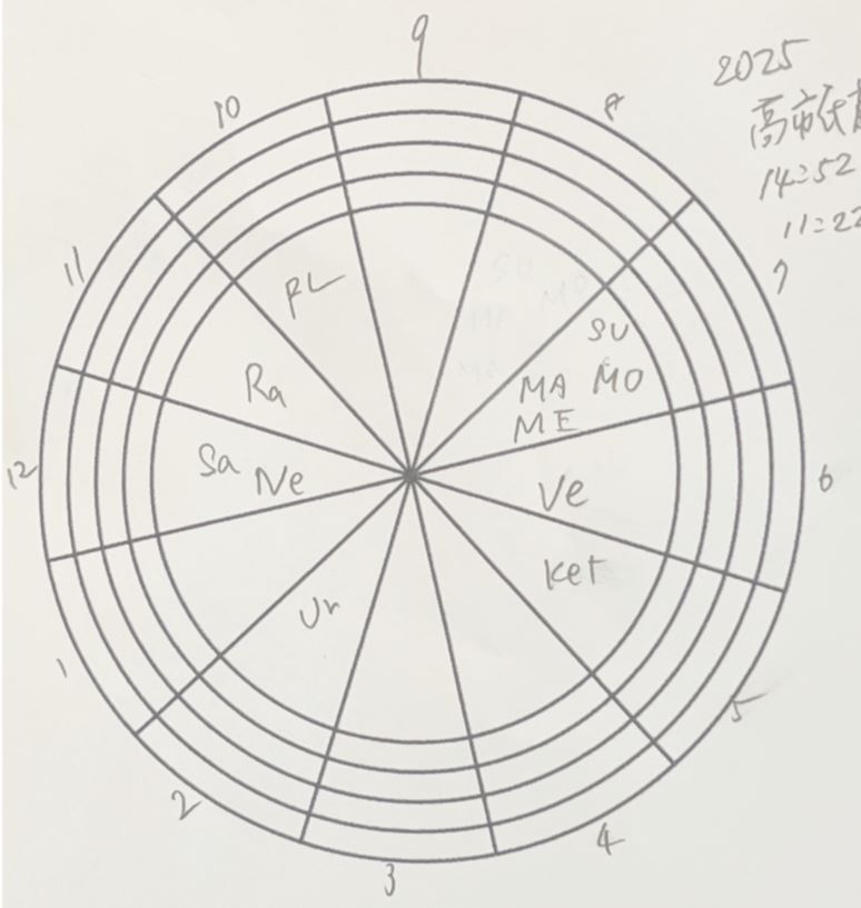 外交(国家間ビジネス、経済など)対外的には、7室が双子座(ルーラーは11室水星神)、9室が獅子座(ルーラーは11室水星神)のケートゥ神で、下手に出たり、追従したりして、したたかに策略を実行しそう。3室ラーフ神。