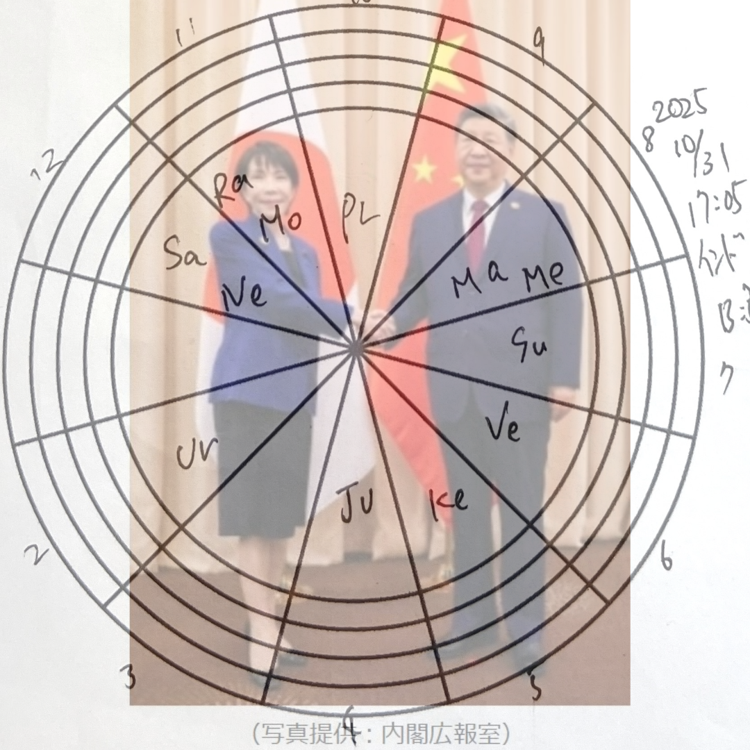 日中首脳会談の時、月神はラーフ神と合。この組み合わせは因縁深い組み合わせ。2室ということで金星神も加味すると、時にわがまま、強欲、強気、やりすぎになる可能性もありです。